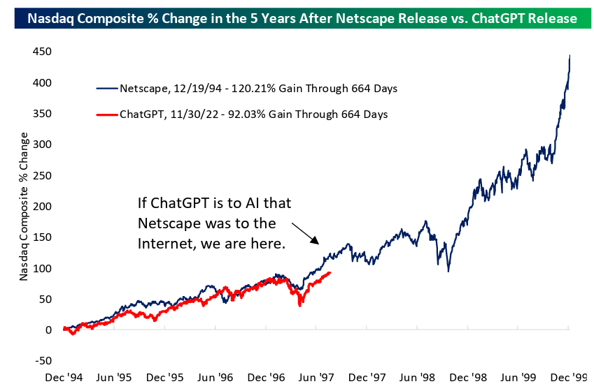 This last piece is copied from Bespoke Premium and is their original work, not mine. They have been tracking the performance of the Nasdaq index since November 2022, around the data OpenAI lauched ChatGPT to the public and comparing it to how the Nasdaq performed from December 1994 when Netscape was launched.
