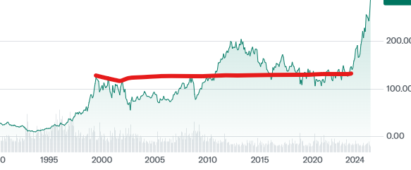 In the year 2000, the stock hit a high around $130. Guess where the stock price was in 2023?