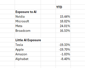To show you what I mean, I am going to look at the Year-to-Date performance of the Magnificent Seven (plus Broadcom so the Magnificent Eight)
