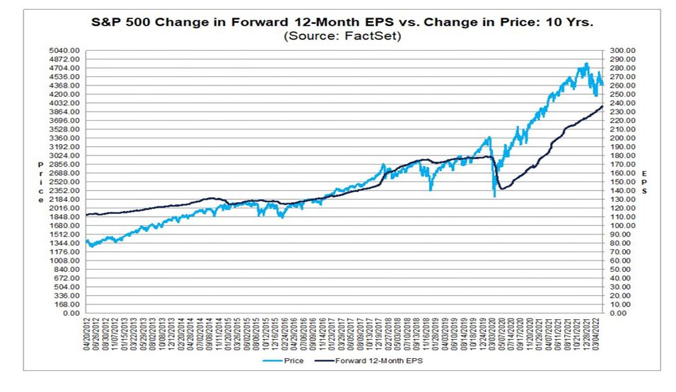 This is very good news for long-term price appreciation. As you can see from this graph from the FactSet research, there is a high correlation between the direction of earnings growth and stock price growth