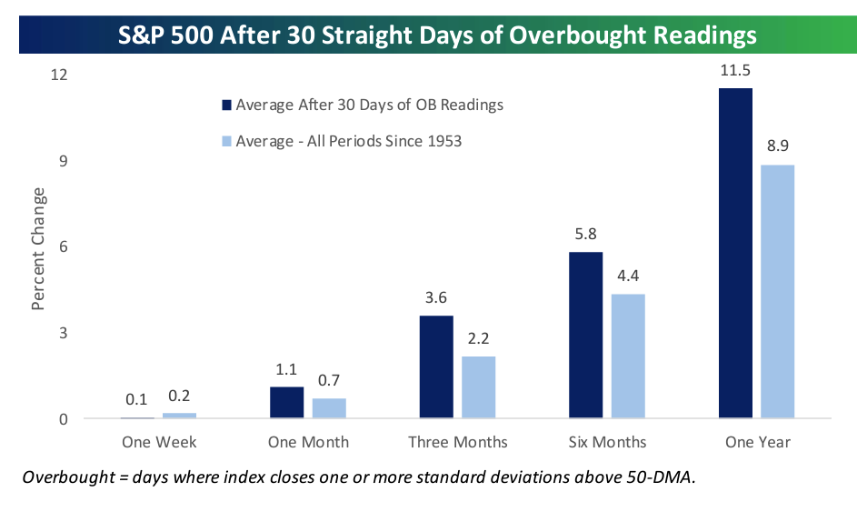 With the market rally chugging along and the S&P 500 making new 52-week highs, the streak of overbought readings (one or more standard deviations above the 50-DMA) has continued. Through Thursday’s close, the S&P 500’s streak has extended to 32 straight trading days. While 32 straight days of overbought readings seems like an extreme, there have been a lot of other streaks of longer durations since the early 1950s when the NYSE shifted to the current five-day trading week. When you hear about the market being overbought, it’s natural to expect a pullback, but as summarized in the chart below, forward returns over the following one, three, six, and twelve months have been better than the average for all periods.